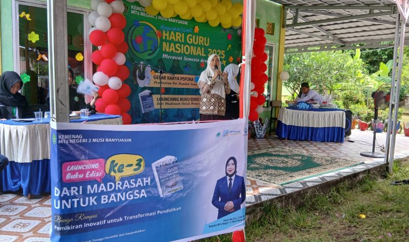 Kepala MTsN 2 Musi Banyuasin membuka secara langsung pelaksanaan Hari Guru Nasional Tahun 2025, Gelar Karya P5P2RA dan Launching Buku Edisi ke-3 buku opini yang berjudul “Dari Madrasah Untuk Bangsa”. Pembukaan ini berlangsung di lokasi depan teras mushola al azhar MTsN 2 Musi Banyuasin.