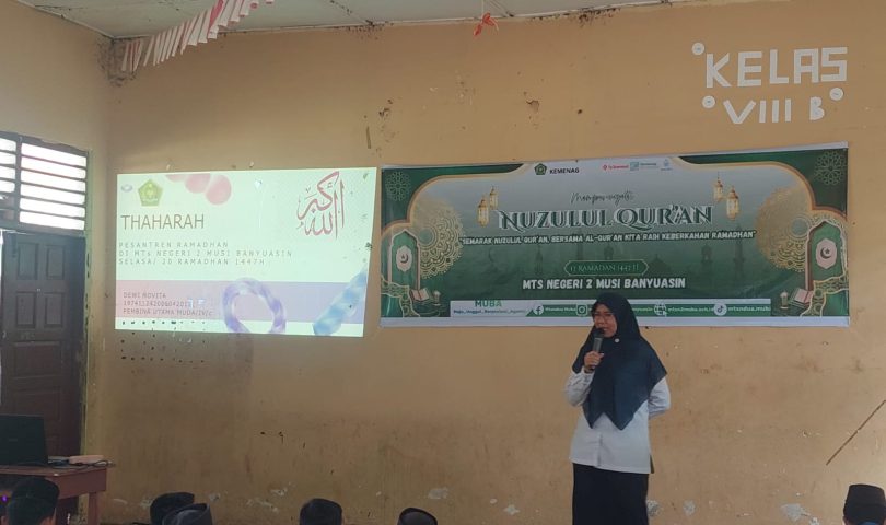 Kepala MTsN 2 Musi Banyuasin Dewi Novita, S.Pd, M.Pd memberikan materi tentang Thaharah dipersantren Ramadan 1447H.